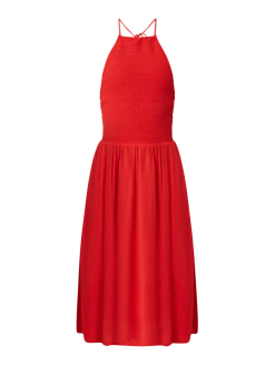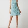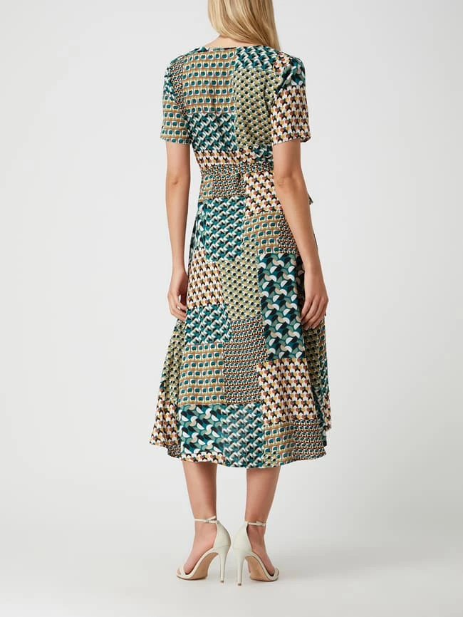 Das Wickelkleid von Apricot ist aus reiner Viskose gefertigt. Es zeigt sich in taillierter Passform mit grafischem Muster, kurzen Ärmeln und Schnürverschluss.