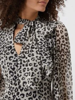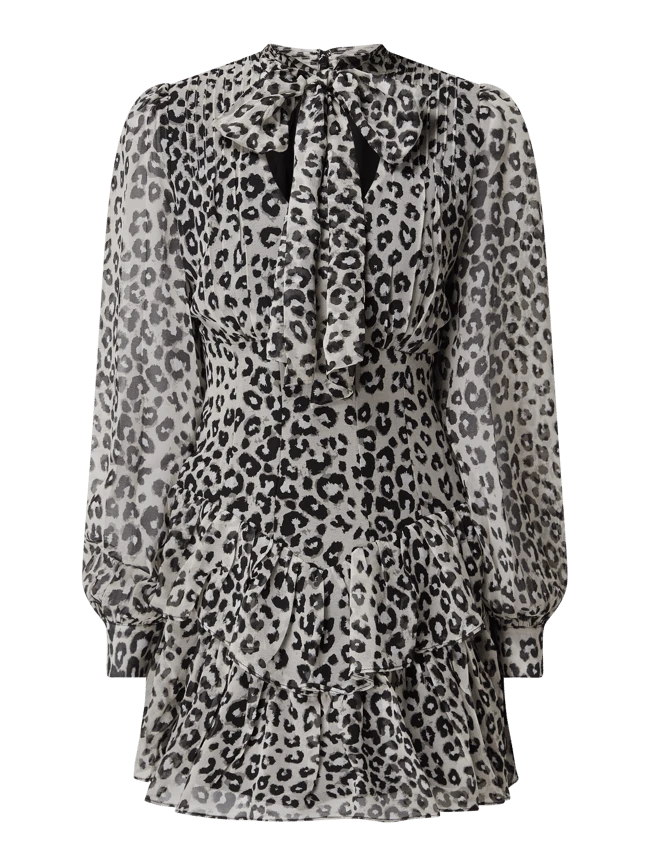 Das Minikleid von Bardot ist aus Chiffon gefertigt und tailliert geschnitten. Es kommt mit Allover-Muster, Schluppe zum Binden und ausgestelltem Rockteil im Stufen-Look.
