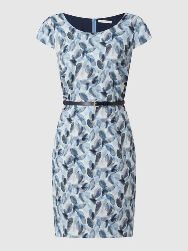 Das Etuikleid von BETTY & CO. ist aus einem Baumwoll-Elasthan-Mix gefertigt. Es zeigt sich in taillierter Passform mit Blättermuster, Rundhalsausschnitt und schmalem Taillengürtel.