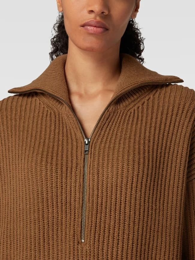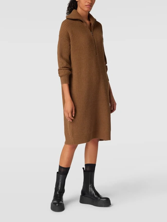 Das Midikleid von DRYKORN ist aus einem Material-Mix mit Woll-Anteil gefertigt und gerade geschnitten. Es zeigt sich in Strick-Optik mit kurzem Reißverschluss und Stehkragen.