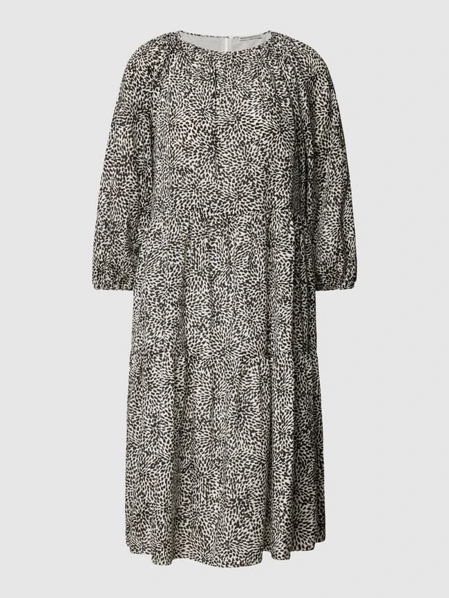 Das Midikleid von DRYKORN ist aus einem Baumwoll-Viskose-Mix gefertigt und locker geschnitten. Es kommt im Stufen-Look mit Allover-Muster, Rundhalsausschnitt und Raffungen.
