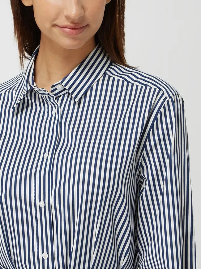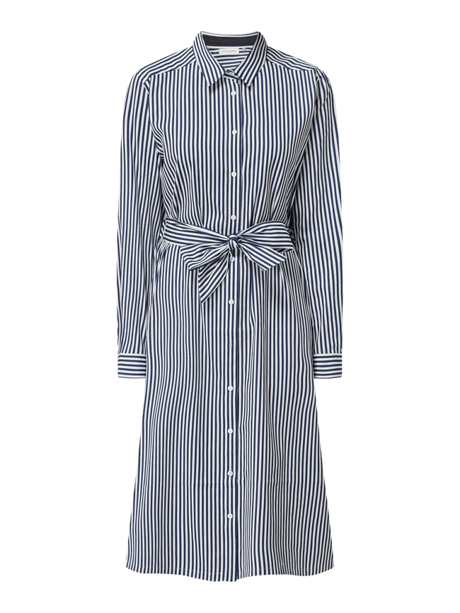 Das Blusenkleid von GERRY WEBER COLLECTION ist aus einer Baumwollmischung mit Stretch-Anteil gefertigt und tailliert geschnitten. Es kommt mit Streifenmuster, Umlegekragen und Taillengürtel.