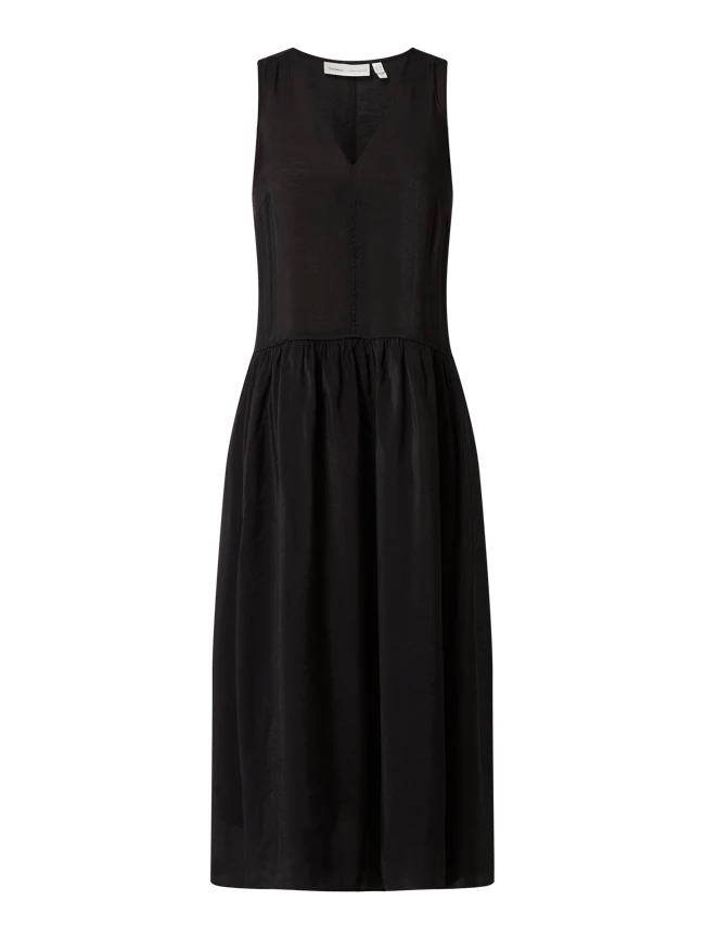 Das Kleid von InWear ist aus einer leichten Viskosemischung gefertigt. Es zeigt sich in A-Linie mit V-Ausschnitt, Teilungsnaht und Raffungen.