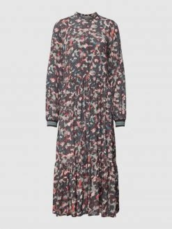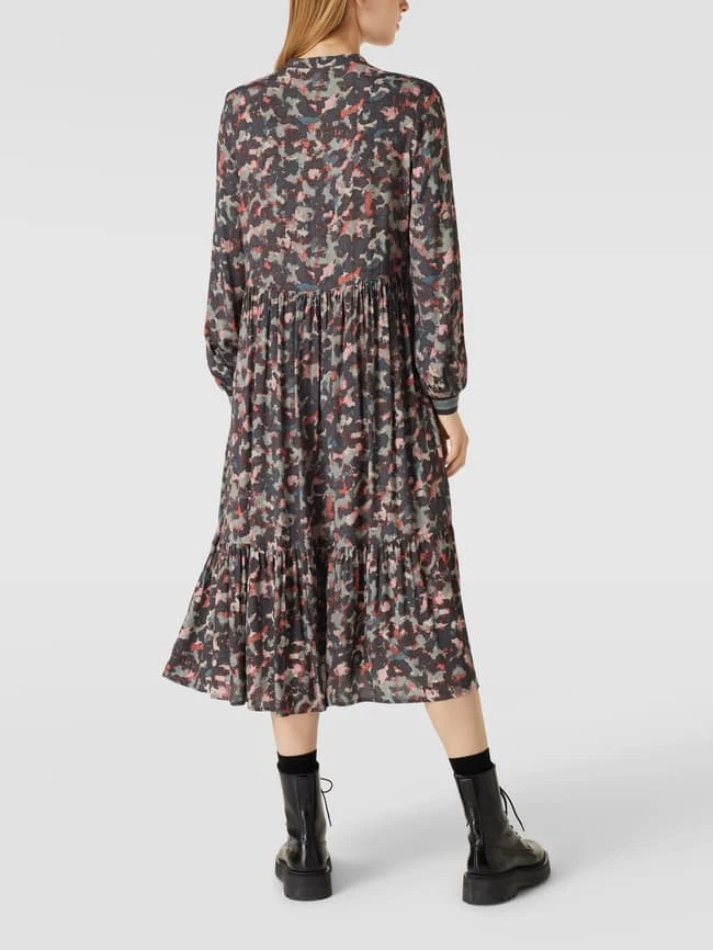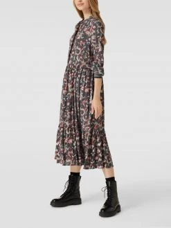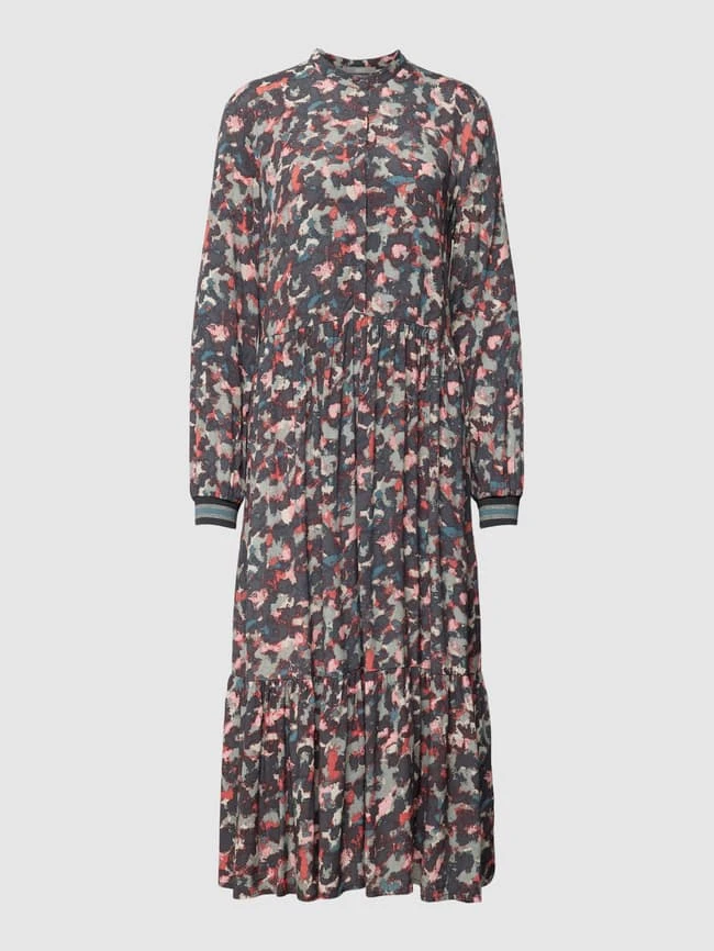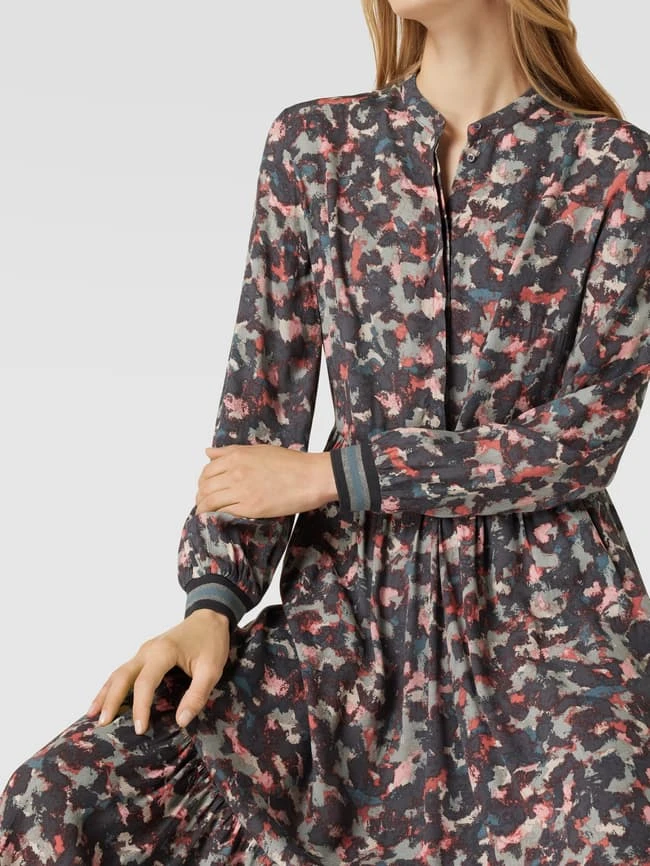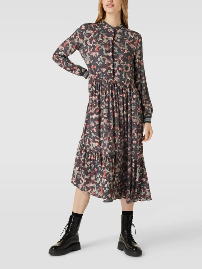Das Midikleid von Jake*s Collection ist aus reiner Viskose gefertigt und gerade geschnitten. Es zeigt sich mit Allover-Muster, Maokragen und verdeckter Knopfleiste.