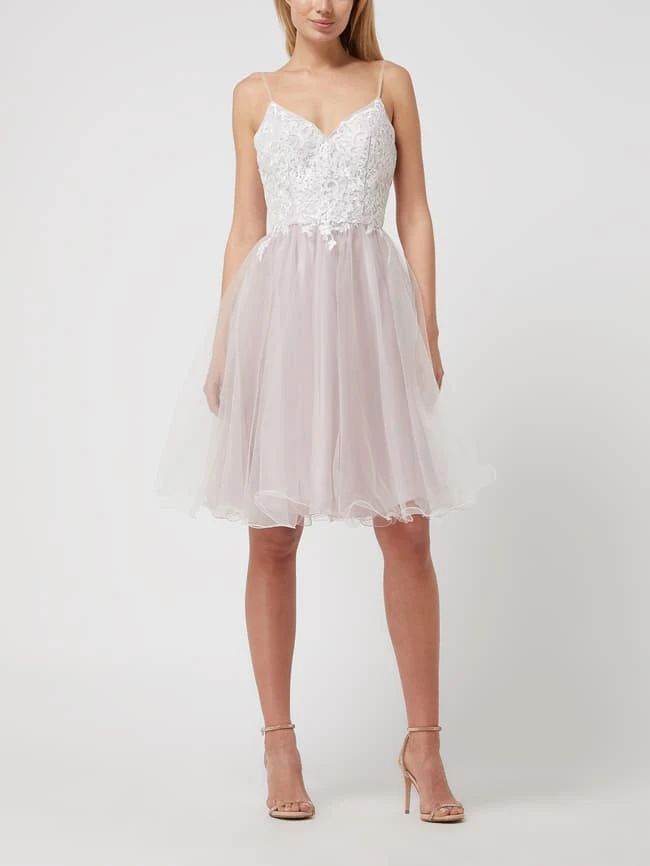 Das Cocktailkleid von LUXUAR MAGIC NIGHTS ist aus Spitze und Tüll gefertigt. Es zeigt sich in taillierter Passform mit Spaghettiträgern, Strasssteinen und ausgestelltem Rockteil mit Muschelsaum.