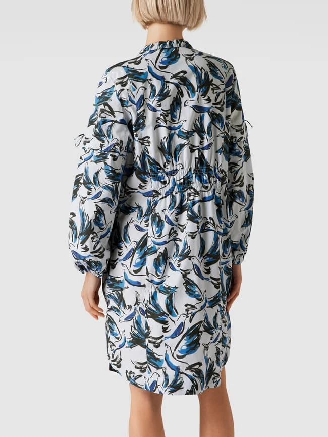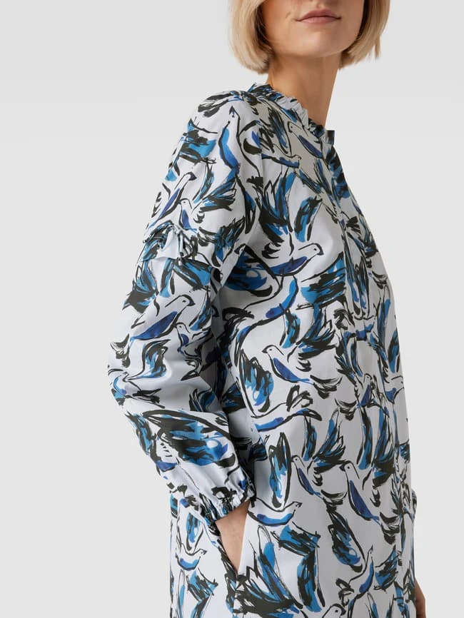 Das Blusenkleid von Marc Cain ist aus reiner Baumwolle gefertigt und locker geschnitten. Es kommt in Knielänge mit Allover-Muster, Stehkragen und kurzer Knopfleiste.