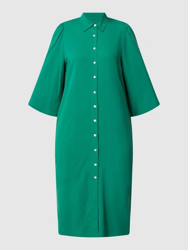 Das Midikleid von mbyM ist aus einem Viskose-Lyocell-Mix gefertigt. Es zeigt sich in ausgestellter Passform mit Umlegekragen und Knopfleiste.
