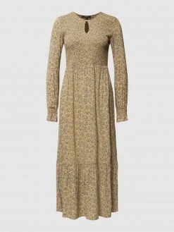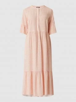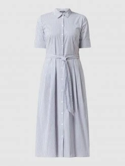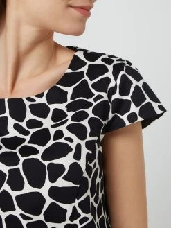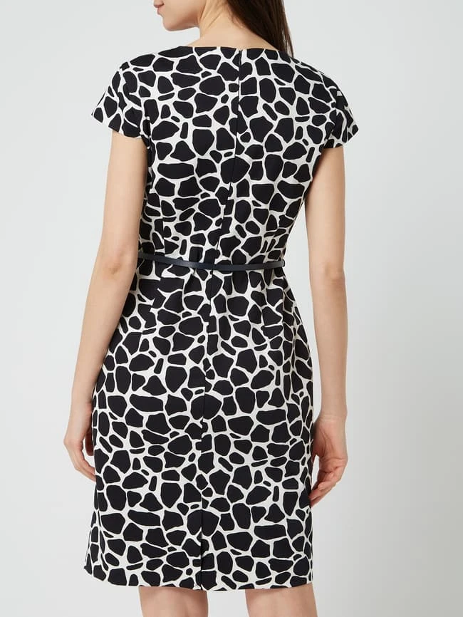 Das Kleid von MONTEGO ist aus einem Baumwoll-Elasthan-Mix gefertigt und tailliert geschnitten. Es zeigt sich mit Animal-Print, schmalem Gürtel und leicht ausgestelltem Rockteil.