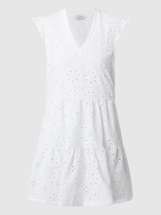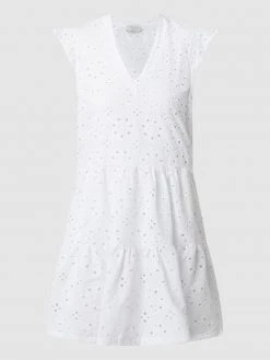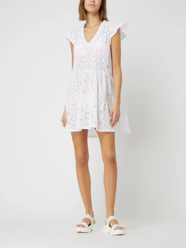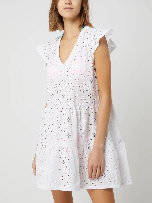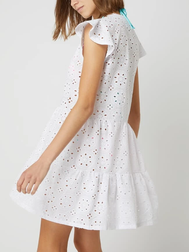Das Kleid von Pink Label ist aus reiner Baumwolle gefertigt und ausgestellt geschnitten. Es zeigt sich im Stufen-Look mit V-Ausschnitt und Flügelärmeln.