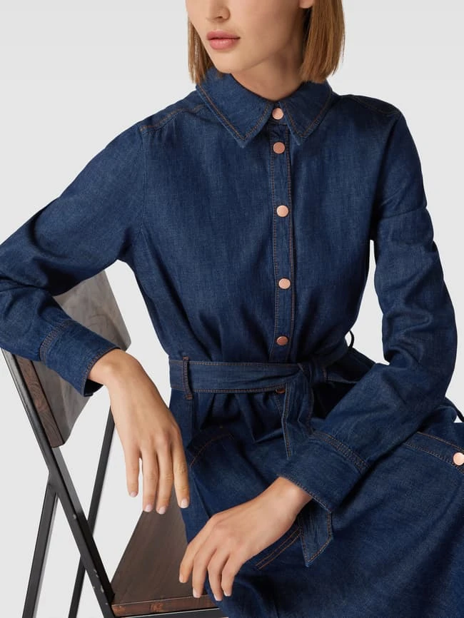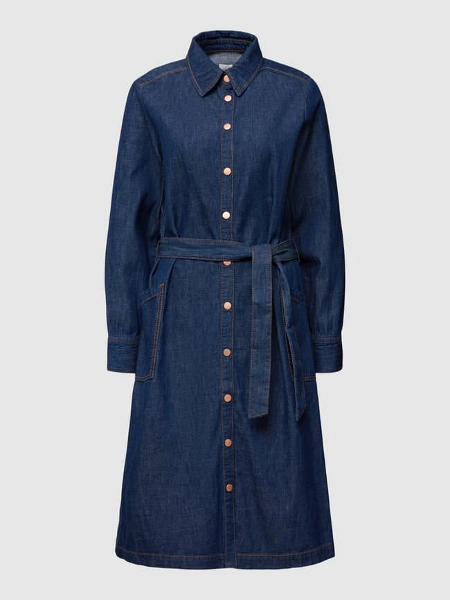 Das Midikleid von s.Oliver RED LABEL ist aus reiner Baumwolle gefertigt und locker geschnitten. Es zeigt sich in Jeans-Optik mit Kontrastnähten und Taillenband.