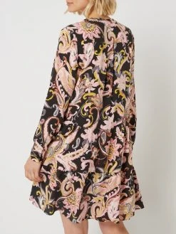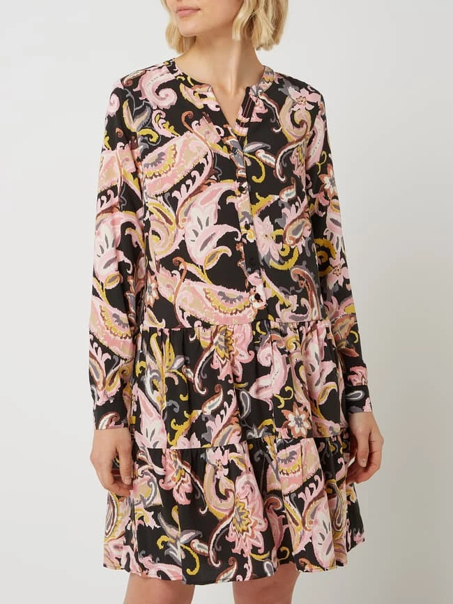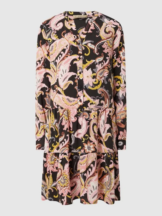 Das Kleid von Smith & Soul ist aus reiner Viskose gefertigt und leicht ausgestellt geschnitten. Es zeigt sich mit Allover-Muster, kurzer Knopfleiste und Raffungen.