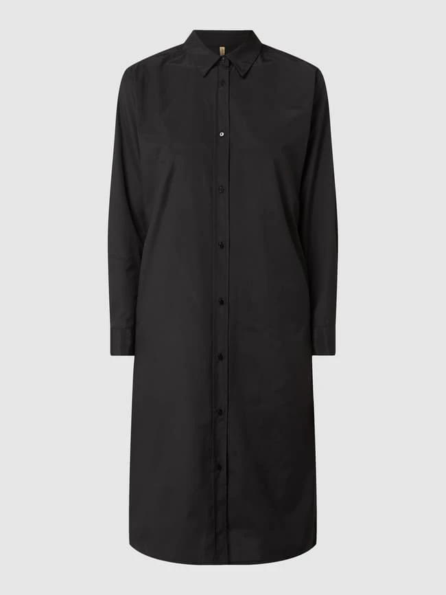 Das Blusenkleid von soyaconcept ist aus recyceltem Polyester und Bio-Baumwolle gefertigt. Es kommt in ausgestellter Passform mit Umlegekragen, Knopfleiste und Eingrifftaschen.