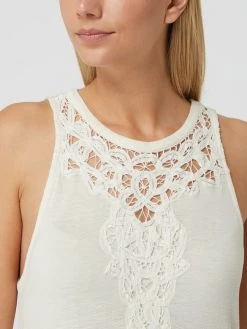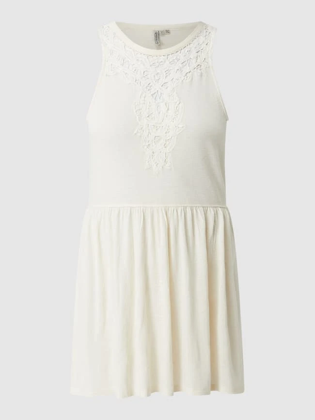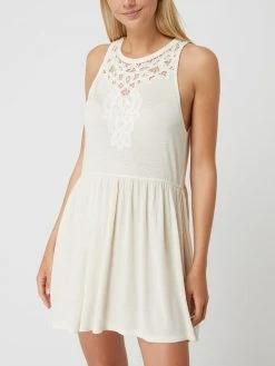 Das Kleid von Superdry ist aus einem Viskose-Leinen-Mix gefertigt und ausgestellt geschnitten. Es zeigt sich mit Rundhalsausschnitt, Häkelspitze und Raffungen.