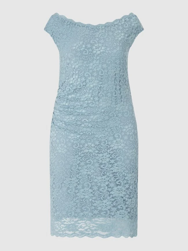 Das Cocktailkleid von Swing ist aus Spitze Curve gefertigt und kommt in eng anliegender Passform. Es zeigt sich mit U-Boot-Ausschnitt, Kappärmeln und seitlich drapierten Falten.