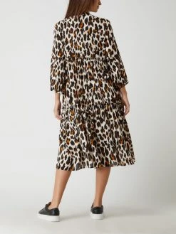 Das Kleid von Tonno & Panna ist aus reiner Viskose gefertigt und ausgestellt geschnitten. Es zeigt sich mit Animal-Print, Tunikakragen und Raffungen.